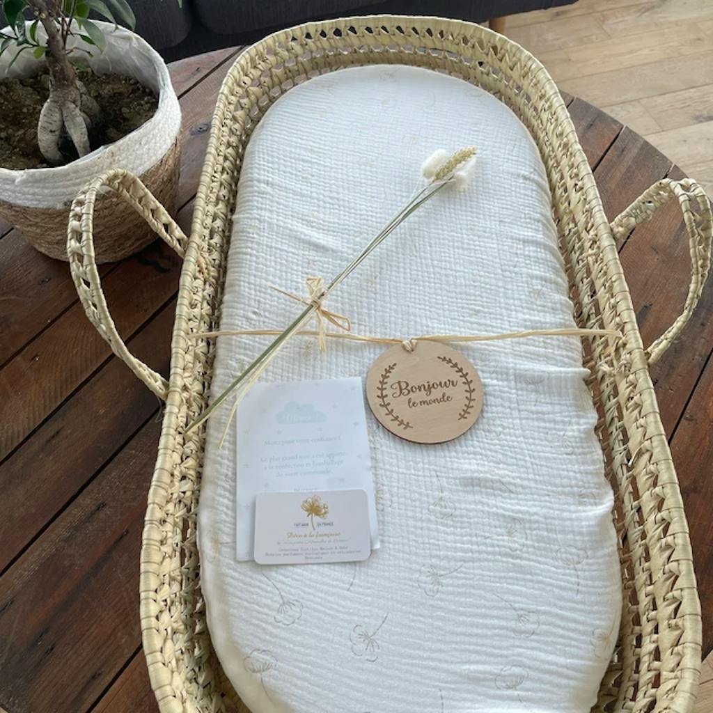 - Un drap housse élastiqué en double gaze de coton complète joliment cet ensemble. Mes draps housses s'adaptent à tous les matelas de couffin/berceau de dimensions standards.