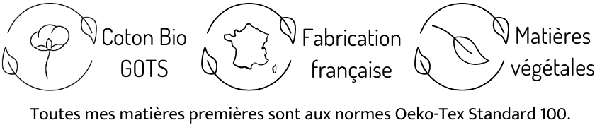 Toutes mes matières premières sont conformes aux normes Oeko-Tex garantissant l'absence de substances nocives pour la santé et l'environnement.